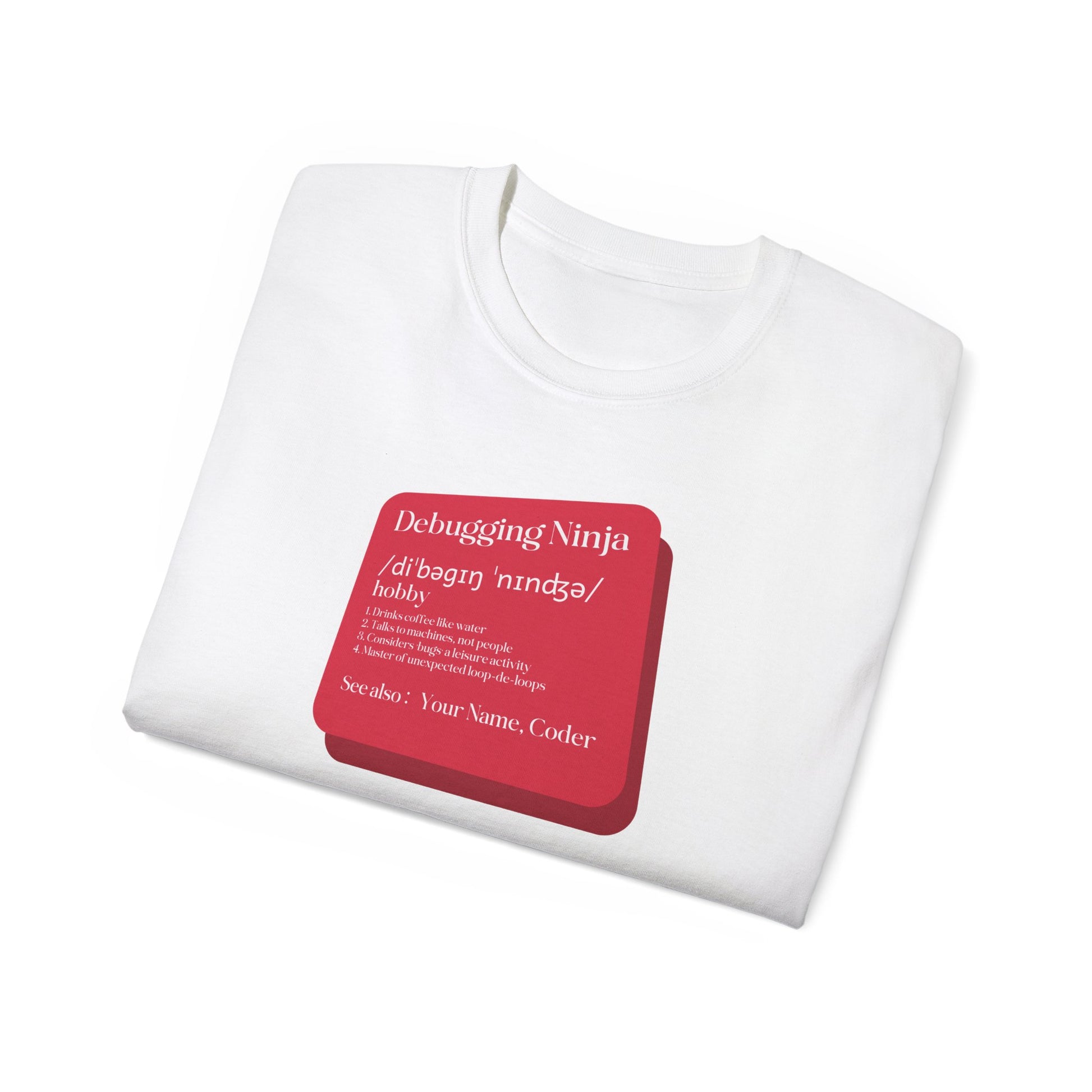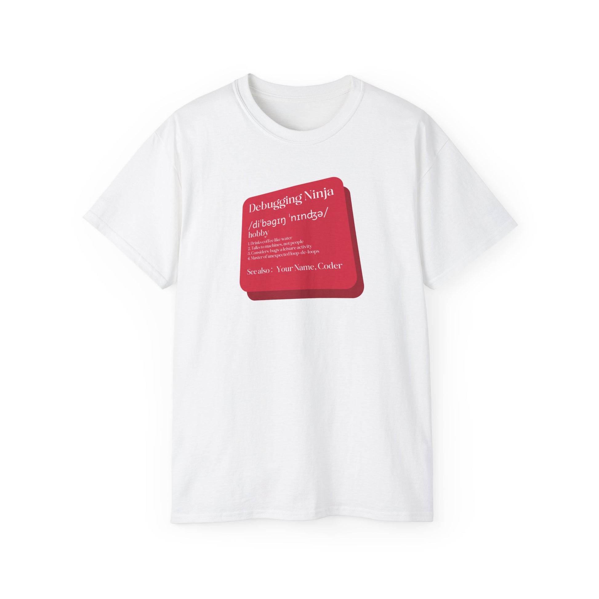 Embrace the coder's lifestyle with our Debugging Ninja tee! Perfect for those who thrive on coffee, communicate with machines, and find joy in hunting bugs. Whether you're tackling coding challenges at a hackathon or just casually debugging at home, this humorous shirt speaks your language. It's the ultimate gift for programming enthusiasts, tech lovers, and anyone who enjoys friendly coding competitions. Let your wardrobe celebrate your passion for coding challenges and bring a smile to your fellow developers!