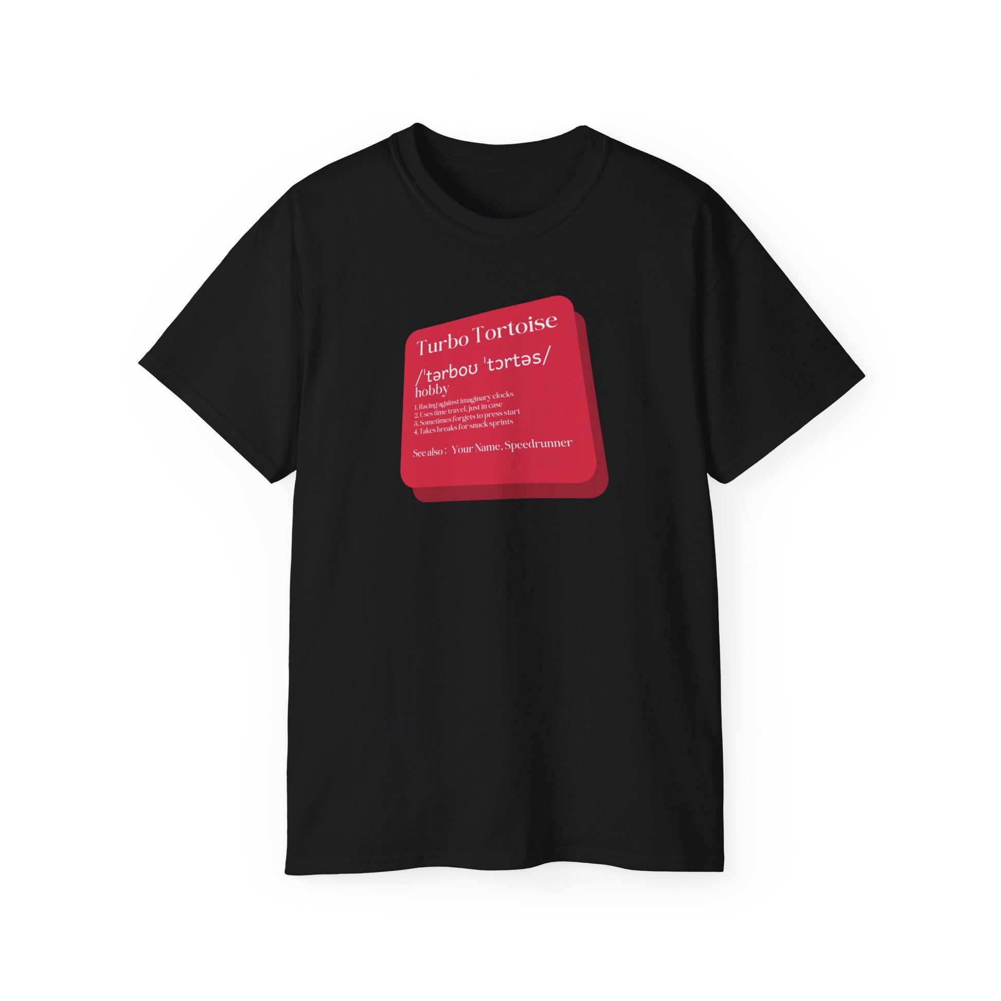 Get ready to dive into the hilarious world of speedrunning with our Turbo Tortoise Speedrunning Champion Tee! This shirt features the ultimate gamer’s motto: 'Racing against imaginary clocks,' 'Uses time travel, just in case,' 'Sometimes forgets to press start,' and 'Takes breaks for snack sprints.' Whether you're clocking in your best time on a beloved game or just enjoying a leisurely snack, this shirt is perfect for every gaming enthusiast. It makes a fantastic gift for speedrunners, gaming fans, and anyone who loves a funny take on gaming culture!